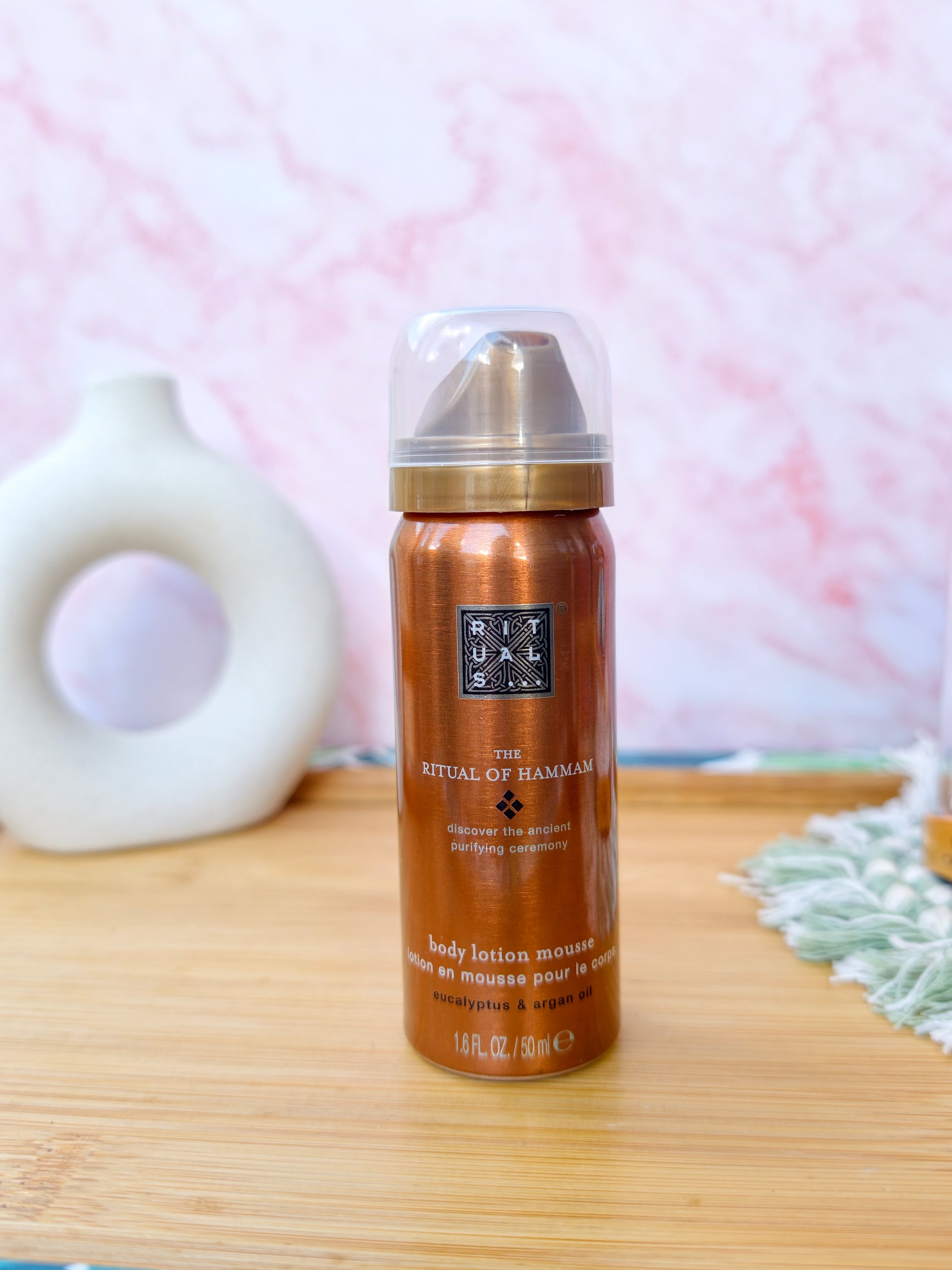 Experience the luxurious ritual of hammam with our bodylotion mousse. Enriched with eucalyptus and argan oil, our unique formula nourishes and moisturizes your skin, leaving it soft, smooth, and refreshed. Treat yourself to a spa-like experience at home with our Ritual of Hammam Bodylotion Mousse.